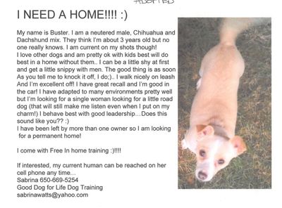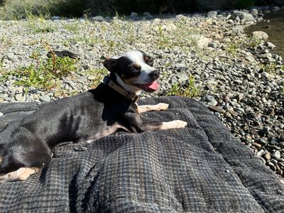 Skippy was headed back to the shelter in late June and we scooped him up to help him find his Forever home. He is about 3 years old, a total lap dog, rides in a backpack, sleeps under covers and is such the little lover! He is animal and kid friendly and is a great little dog to keep with you all day. He rides well in the car and can hike miles!